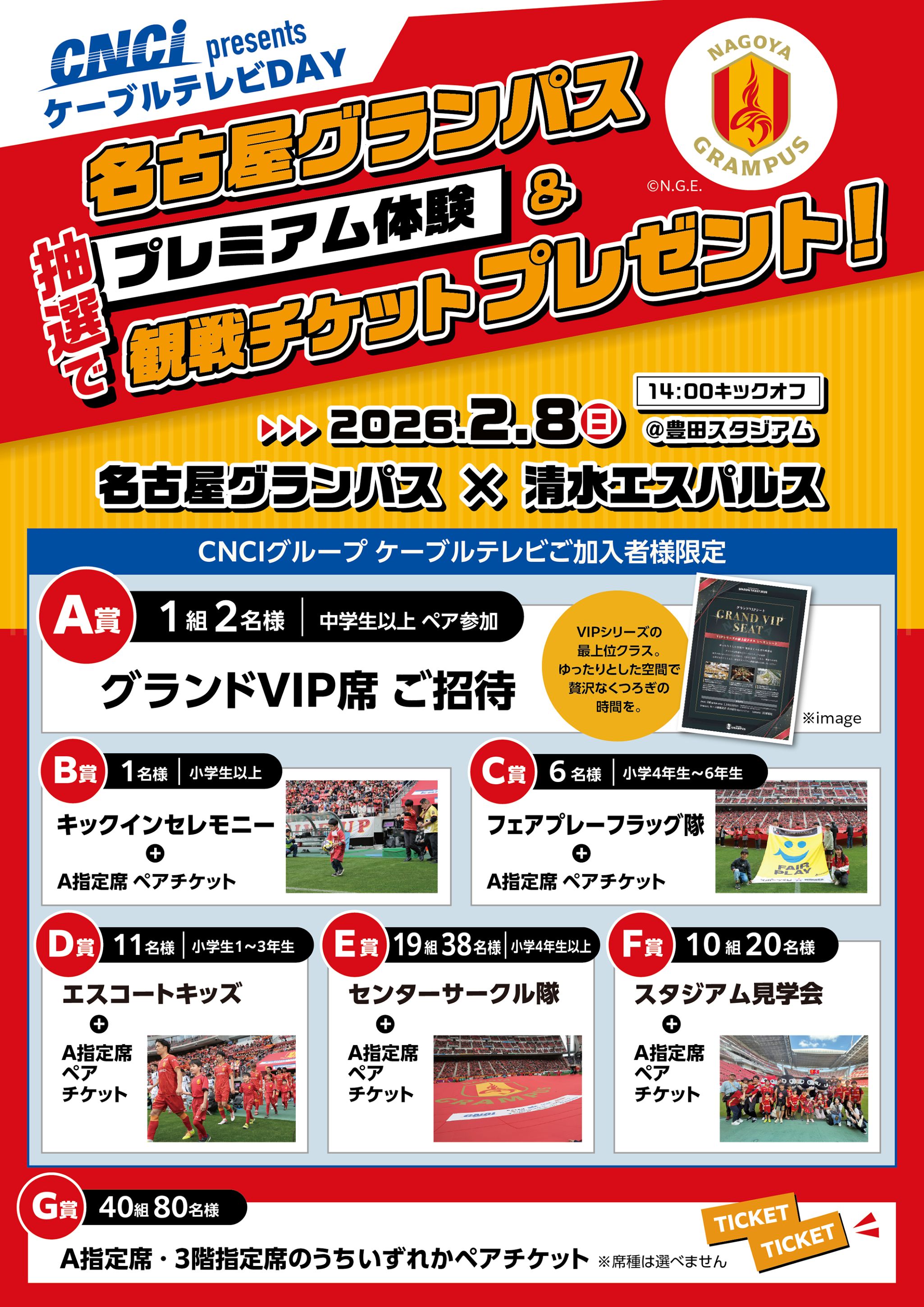 CNCI presents 名古屋グランパス ケーブルテレビDAY プレミアム体験&観戦ペアチケットをプレゼント!